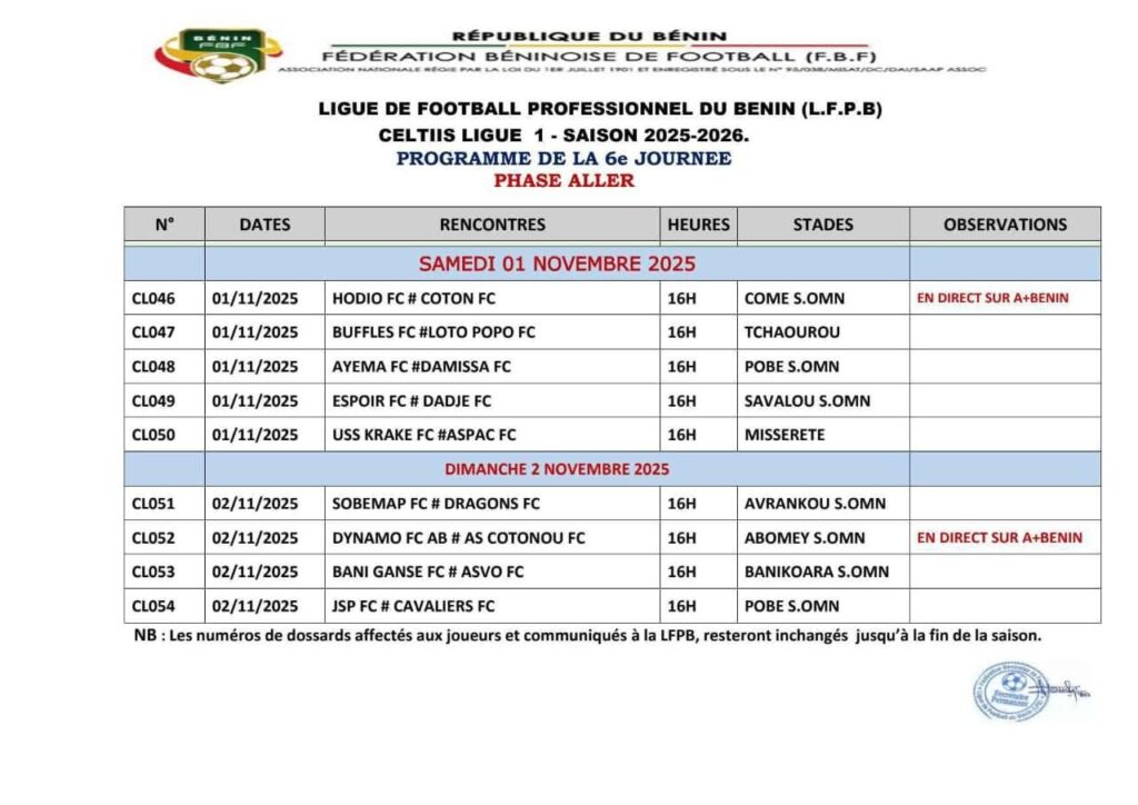 Au menu de cette nouvelle levée, deux affiches majeures retiendront particulièrement l’attention des téléspectateurs, puisqu’elles seront diffusées en direct sur la chaîne A+ Bénin. Le samedi, le Hodio FC recevra le Coton FC au stade omnisports de Comè. Le lendemain, le Dynamo FC AB affrontera l’AS Cotonou FC au stade omnisports d’Abomey.